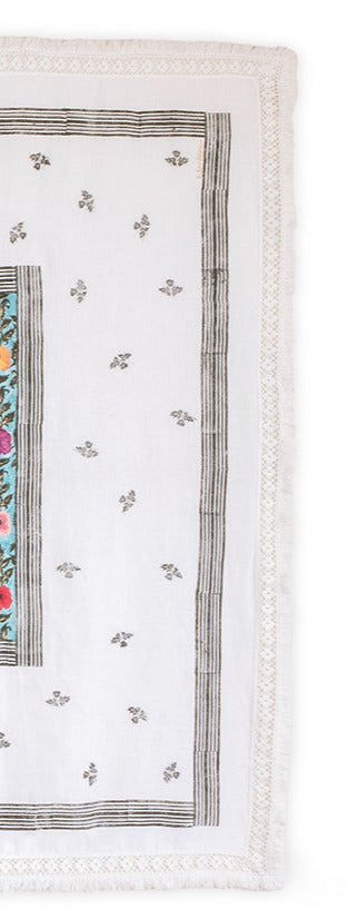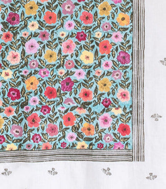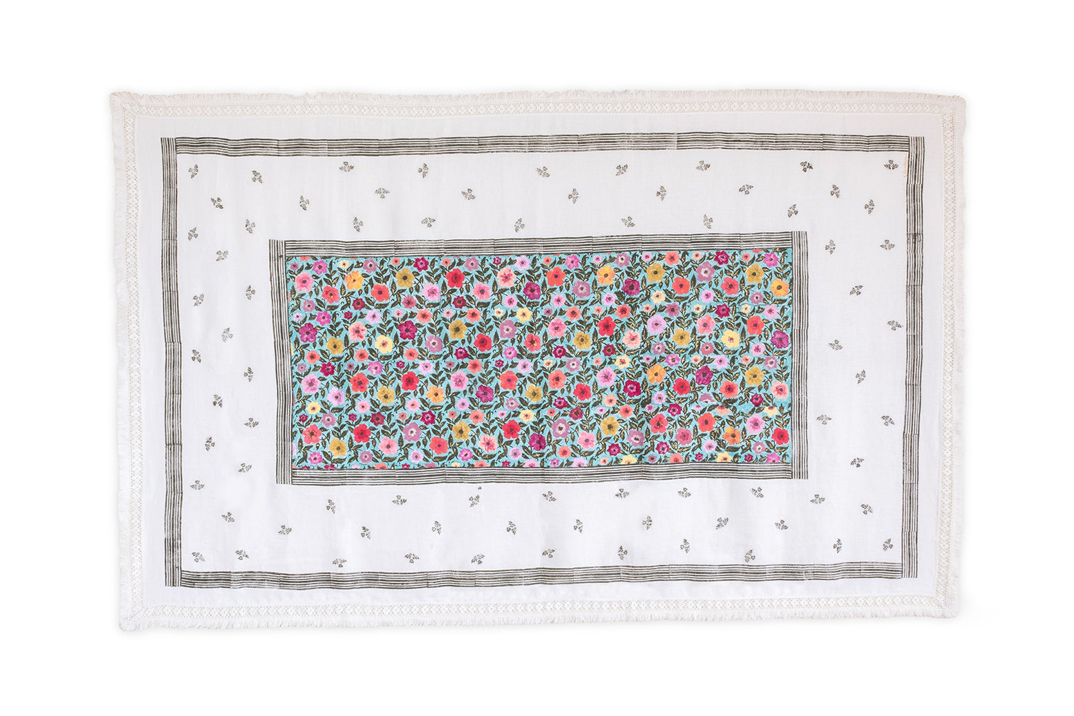 100% linen. Block-printed flower motifs, with detailed vibrant hand-painted colours and gold on a turquoise background, form a stunning centrepiece highlighted by terre verte stripes