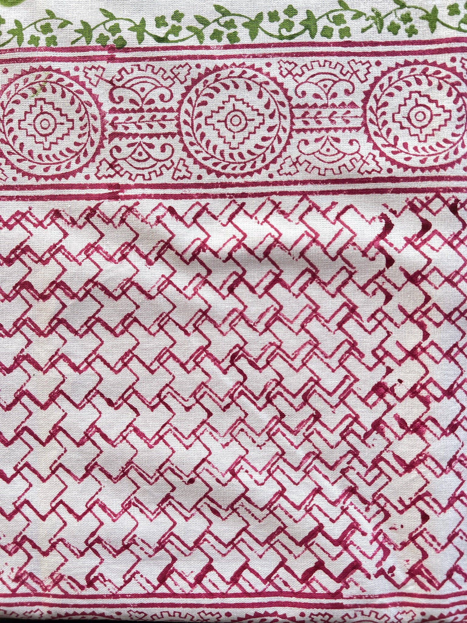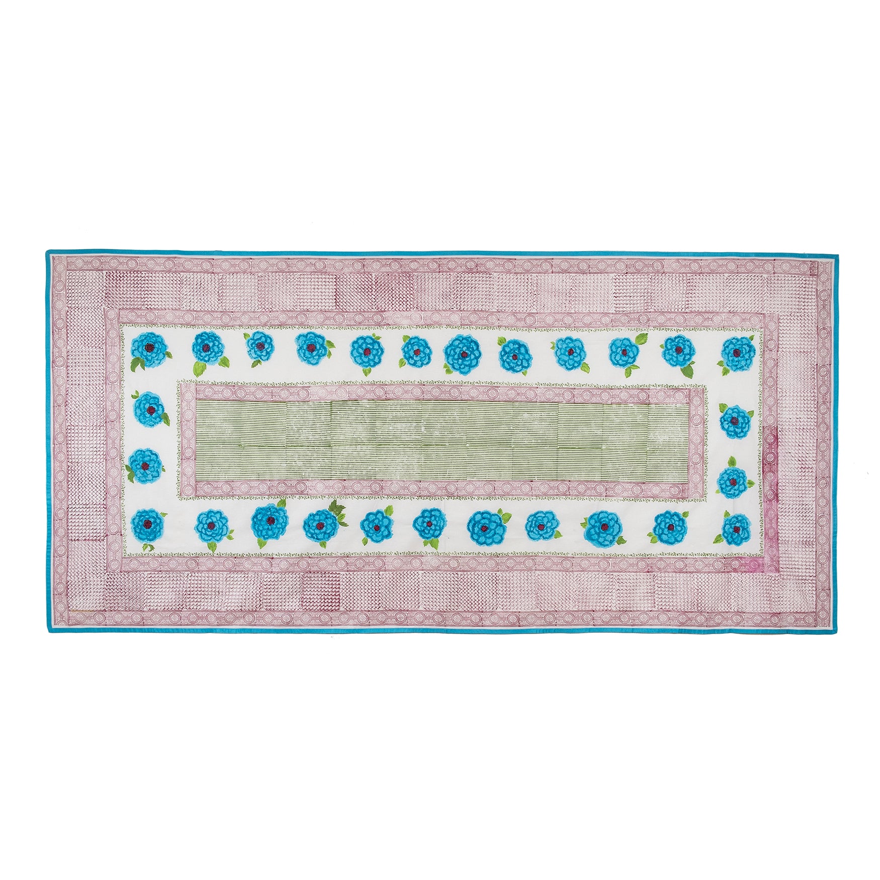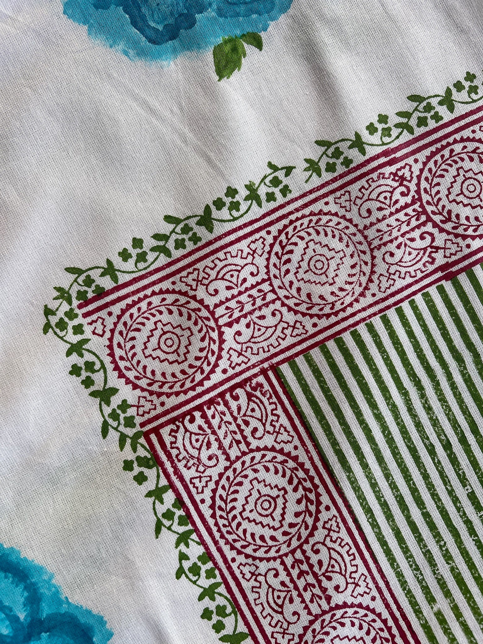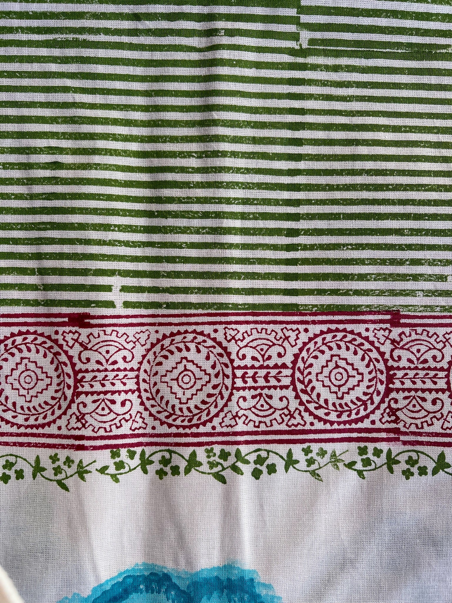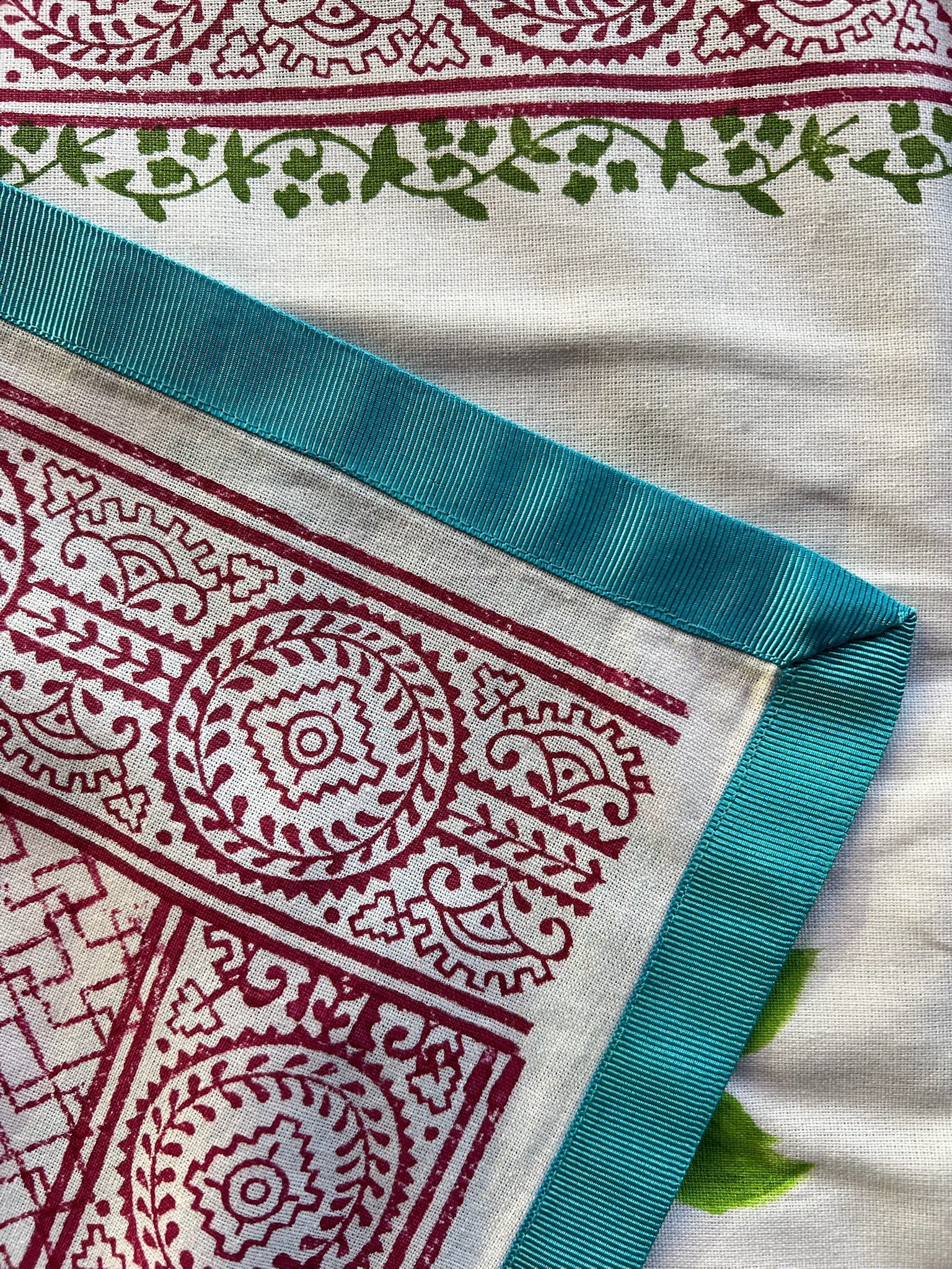 100% cotton. White background with block printed oak leaf green, and maroon boards and centre. 100% handpainted flowers in turquoise, maroon and green. Finished with turquoise grosgrain trim.