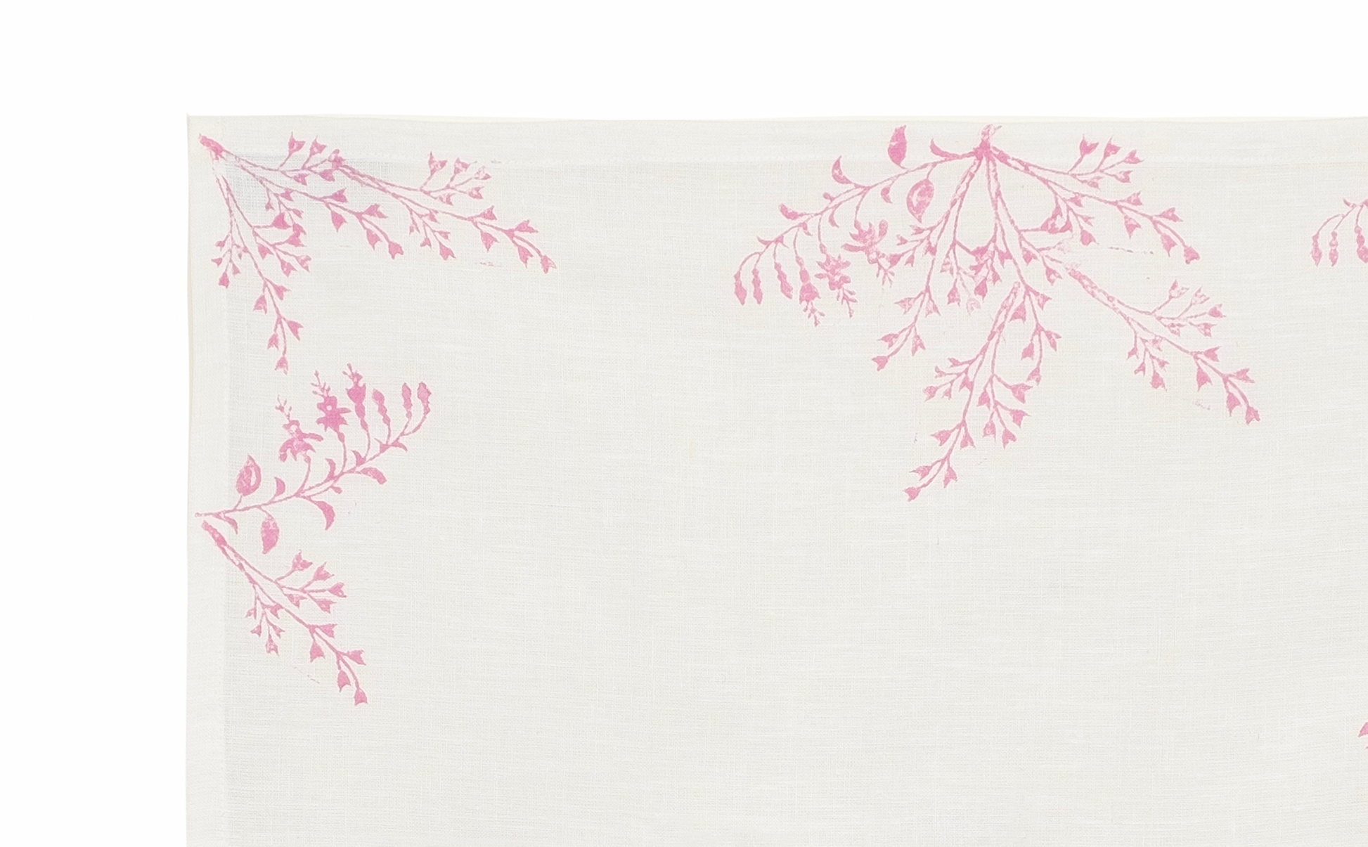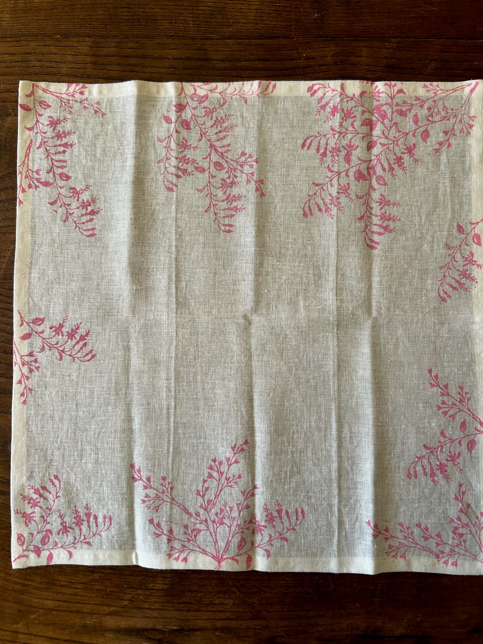100% linen. Six (6) block printed napkins with wild flower motif in soft pink on white background.