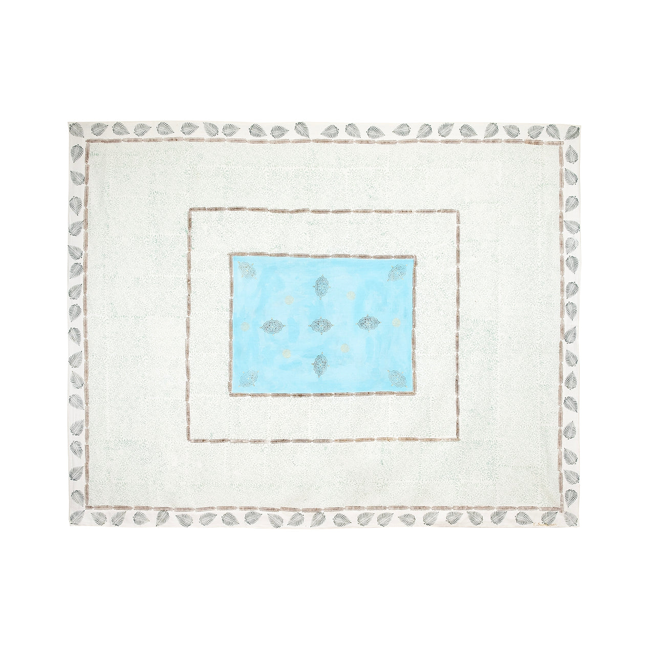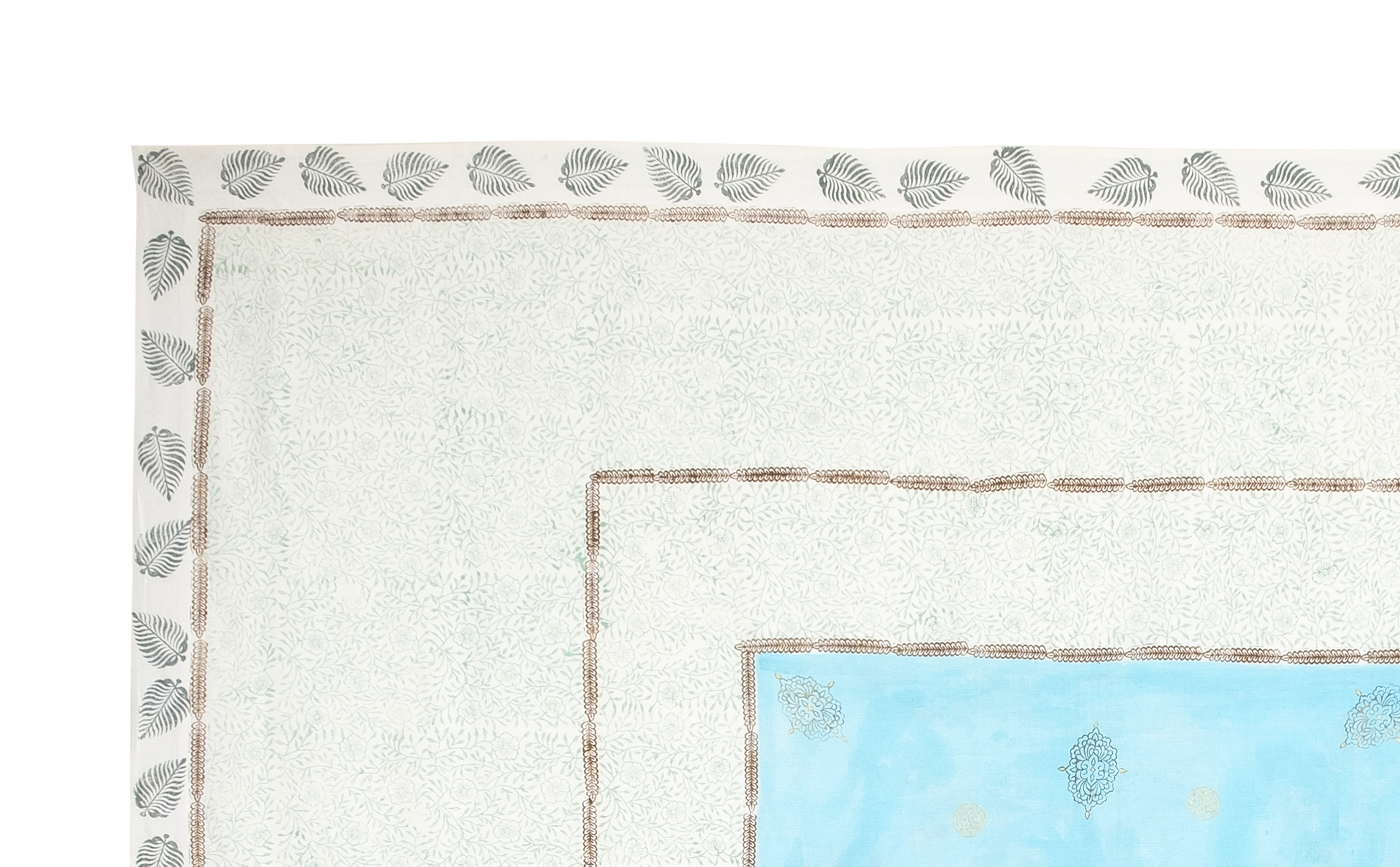 Linen and cotton. White background with sage green, copper and gold blockprinted motifs. Hand finished in turquoise and gold.