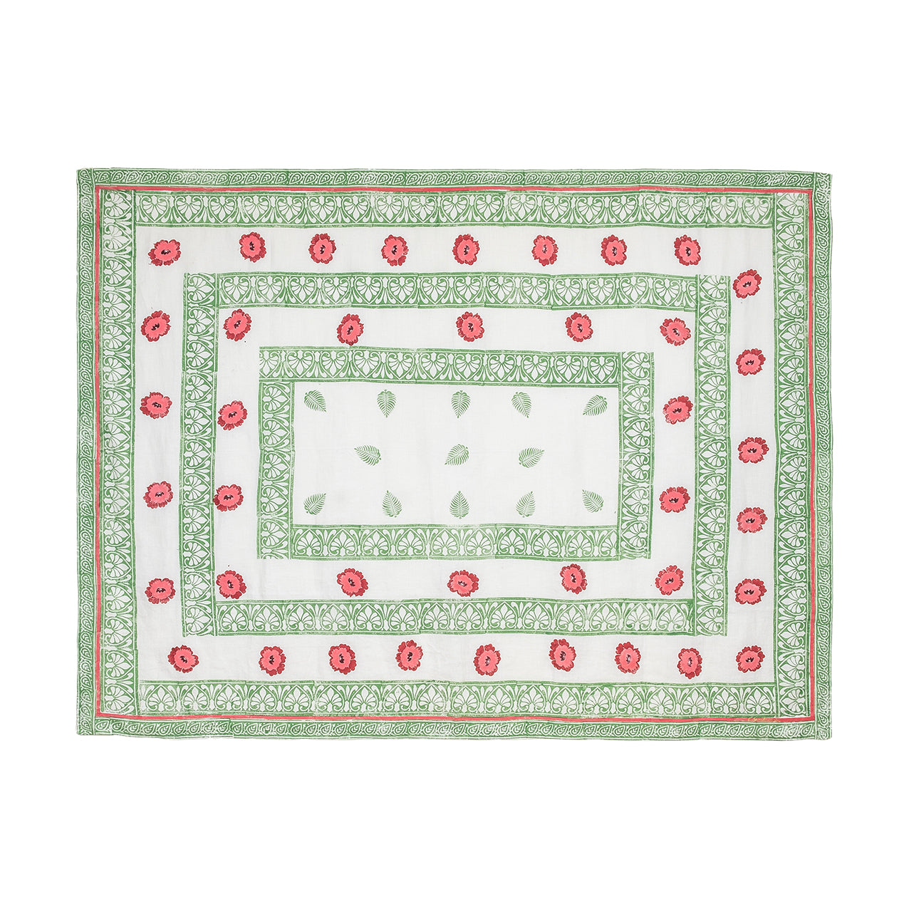 100% linen. Hand painted flowers on white background with block printed motifs in pink, green, maroon and aubergine.