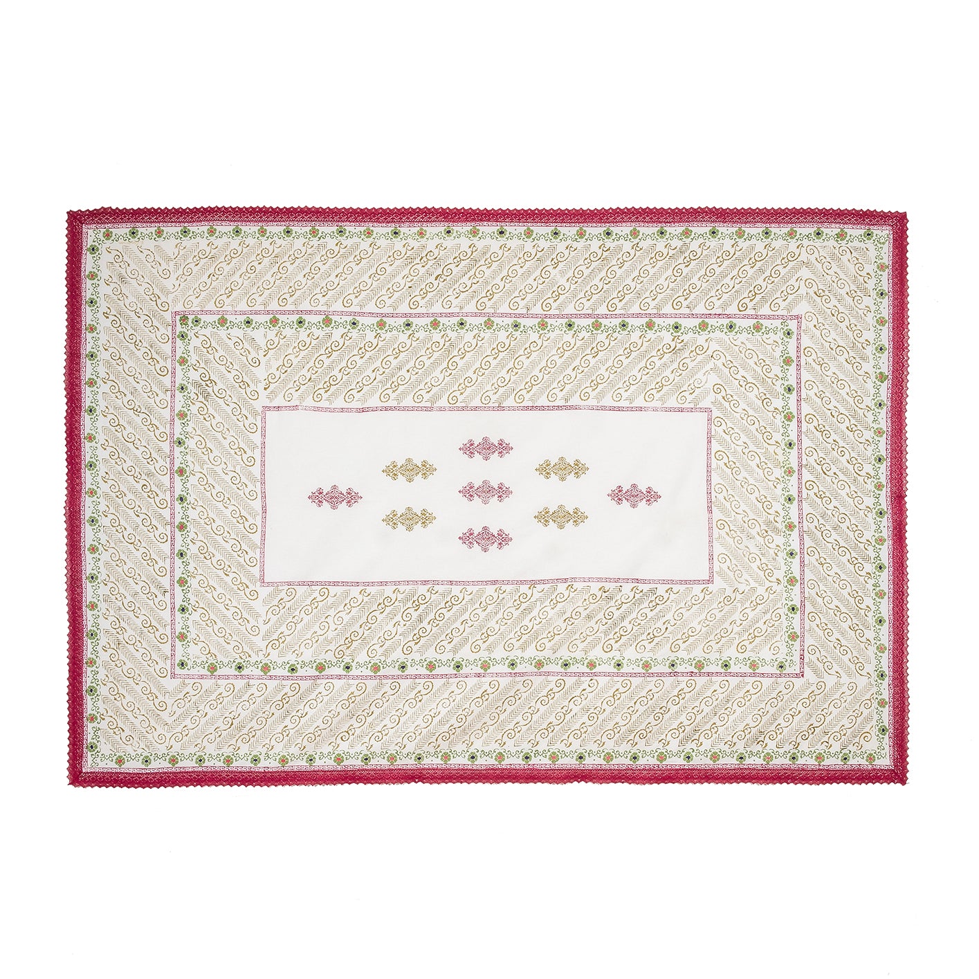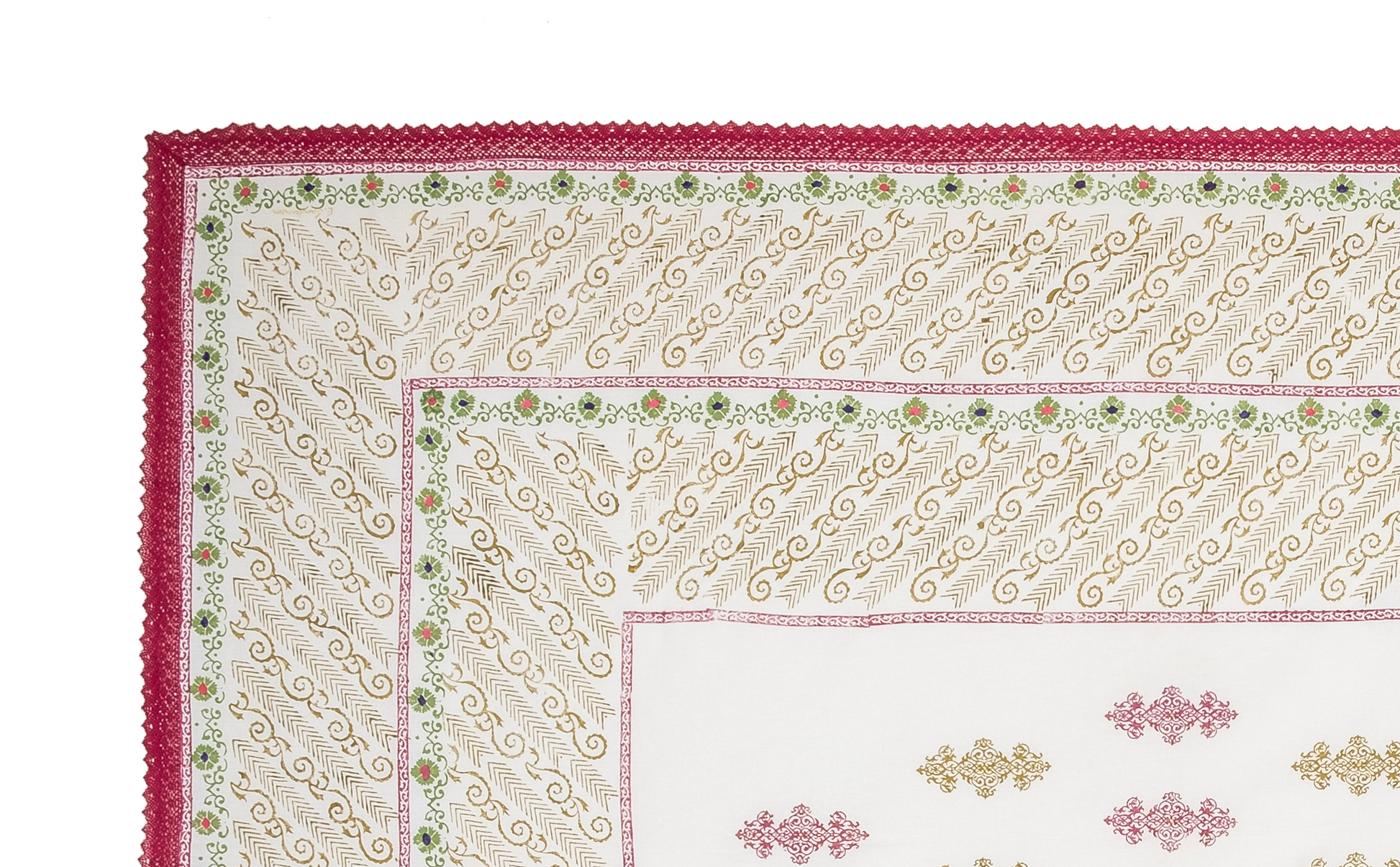 100% cotton. Exotique block printed motifs in olive gold, maroon and flower border in green, pink and purple on white background. Hand painted details in purple, pink and gold. Finished with maroon lace trim (4.0cm)