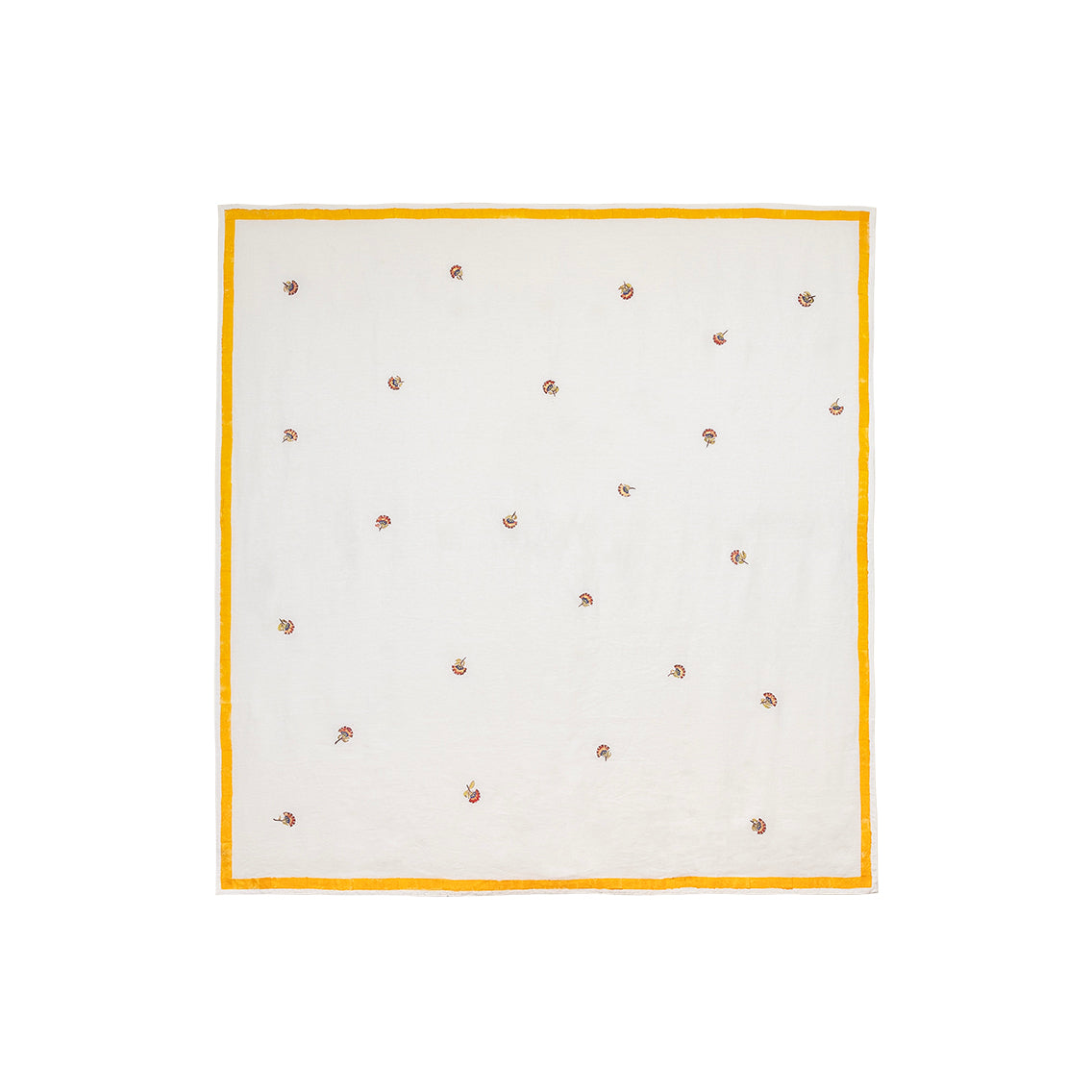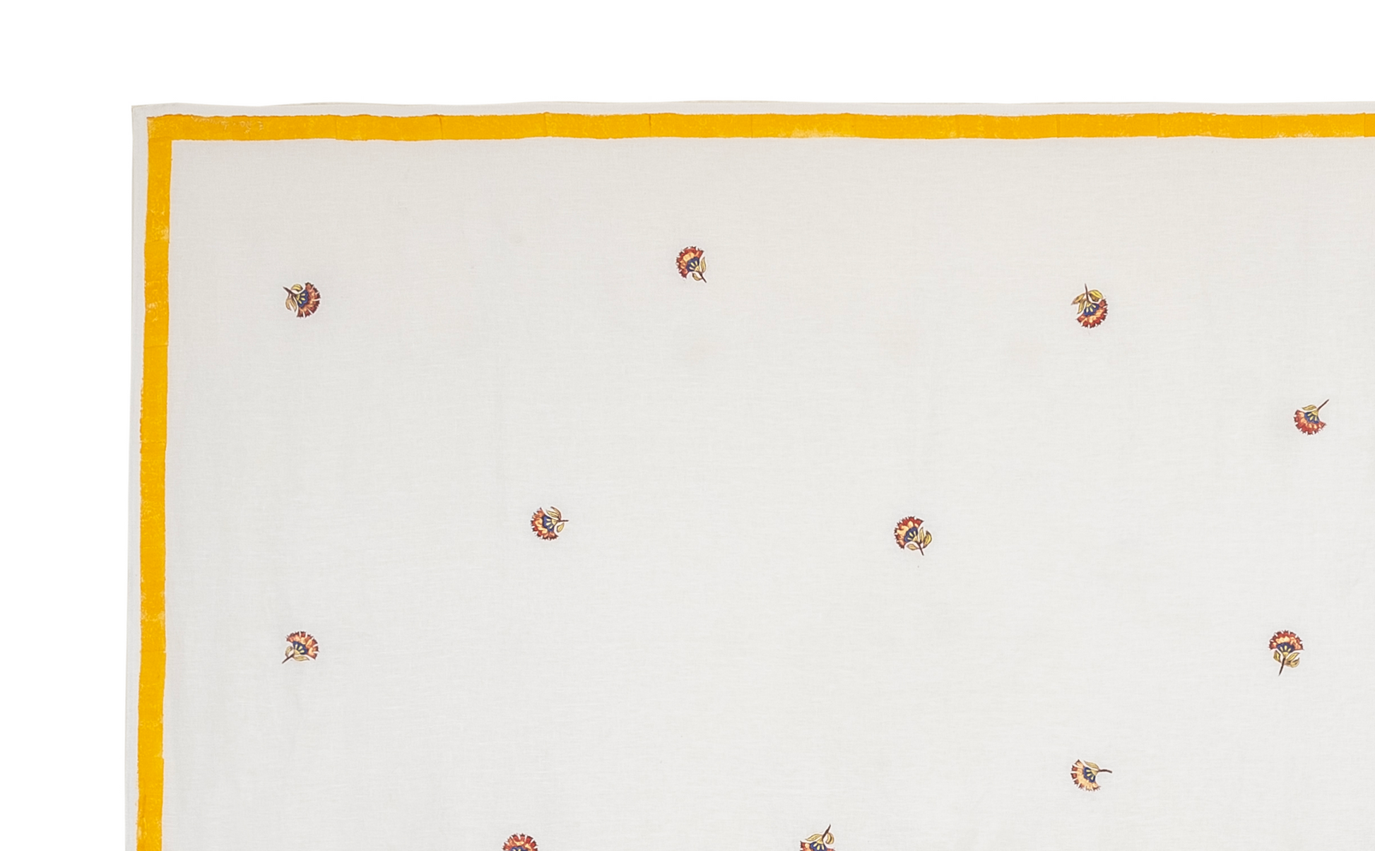 100% linen. Block printed carnations on white background with solid ocre border.