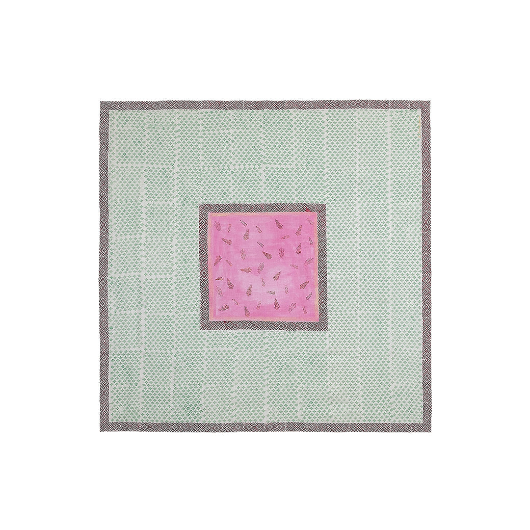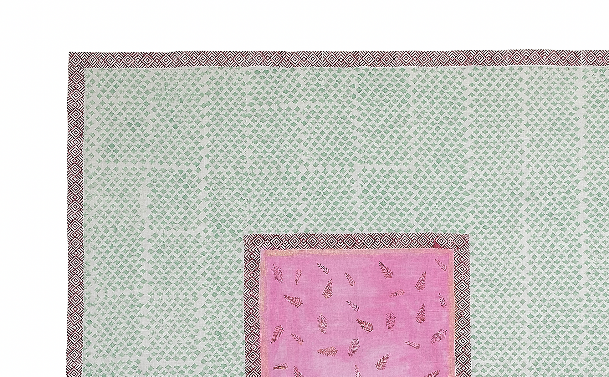 100% linen. Handpainted pink background with block printed motifs in aubergine, sage green and gold.