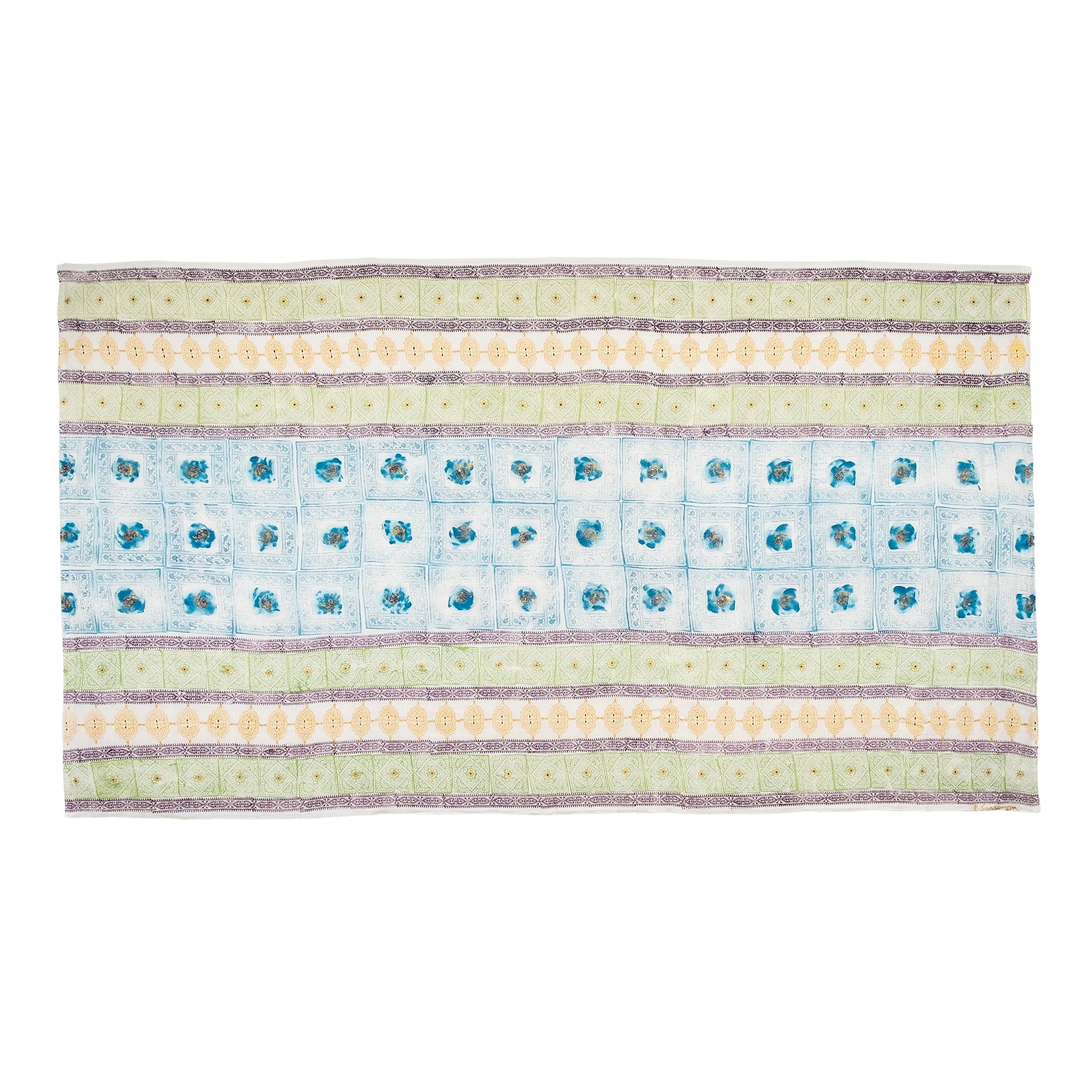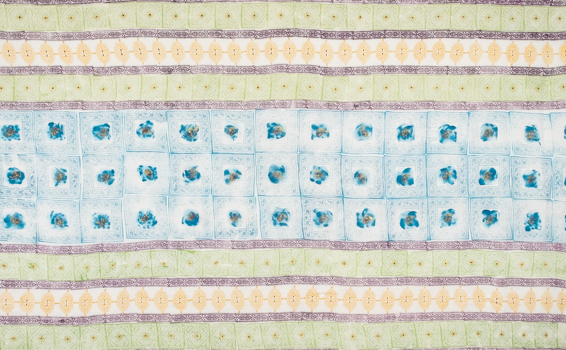 100% linen. Blockprinted and hand painted details. Patterns in aubergine, ochre, lettuce green and turquoise. Maroon and gold hand painted highlights.