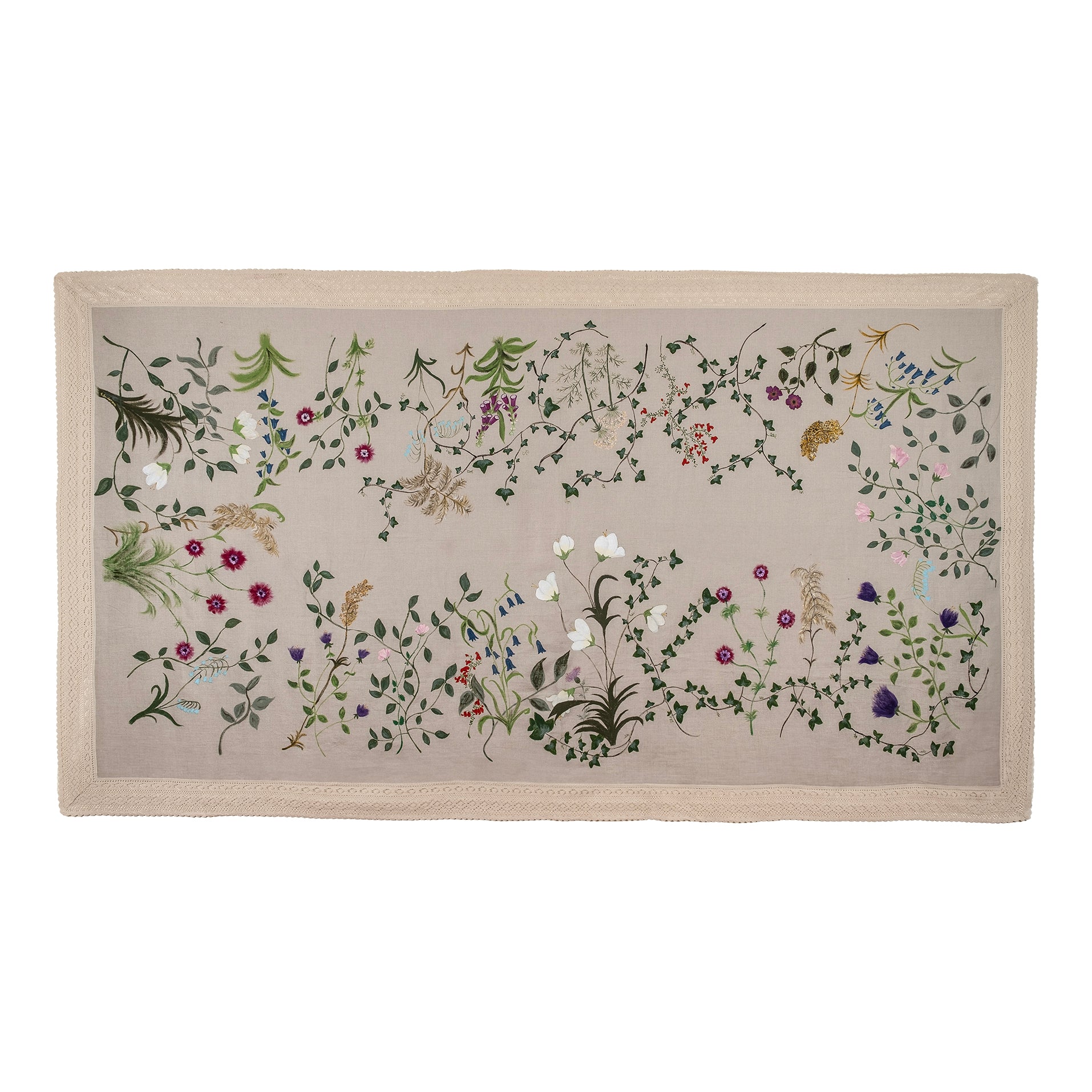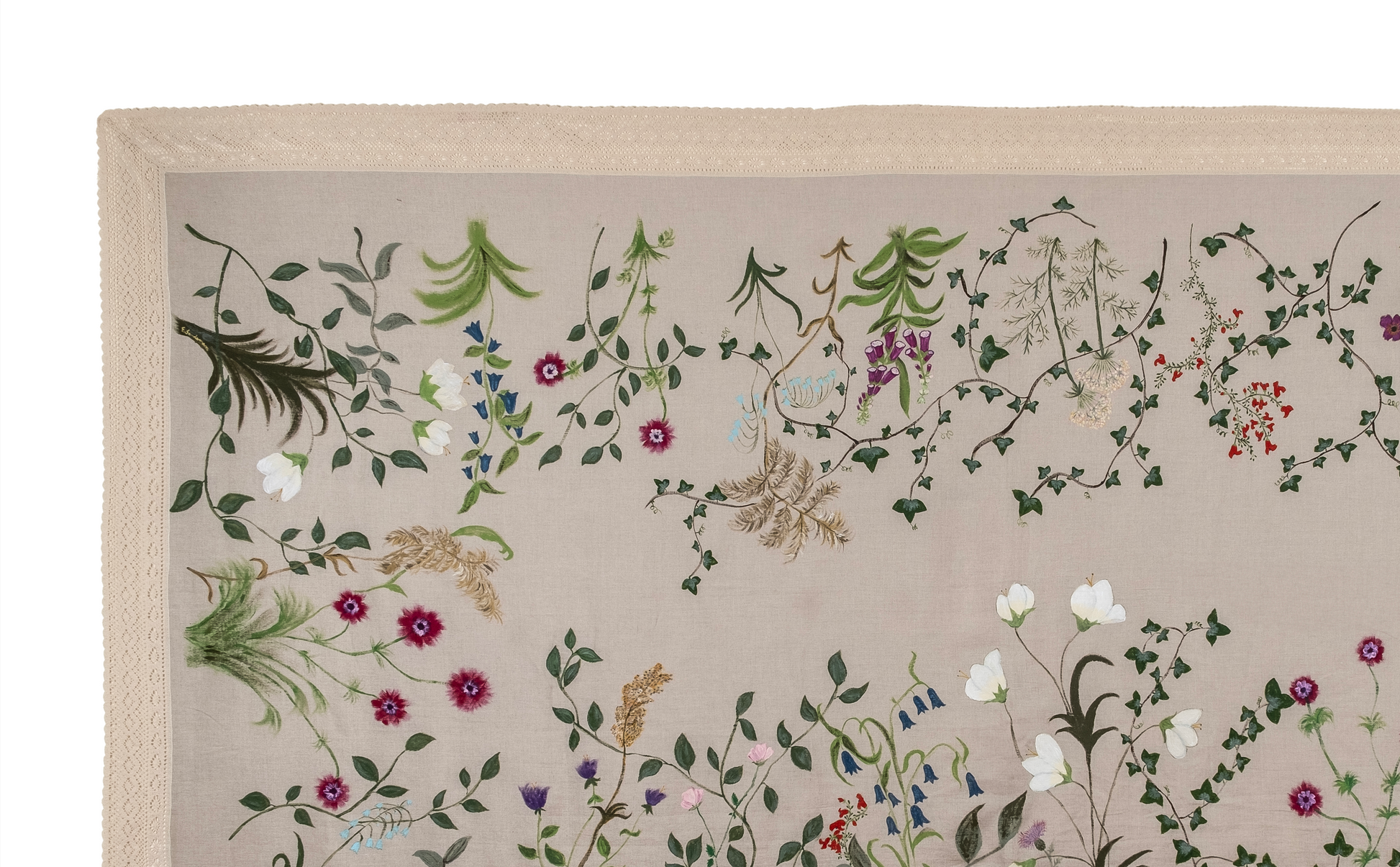 100% linen. Natural linen colour, with 100% handpainted motives of an English garden. Finished with beige lace trim.