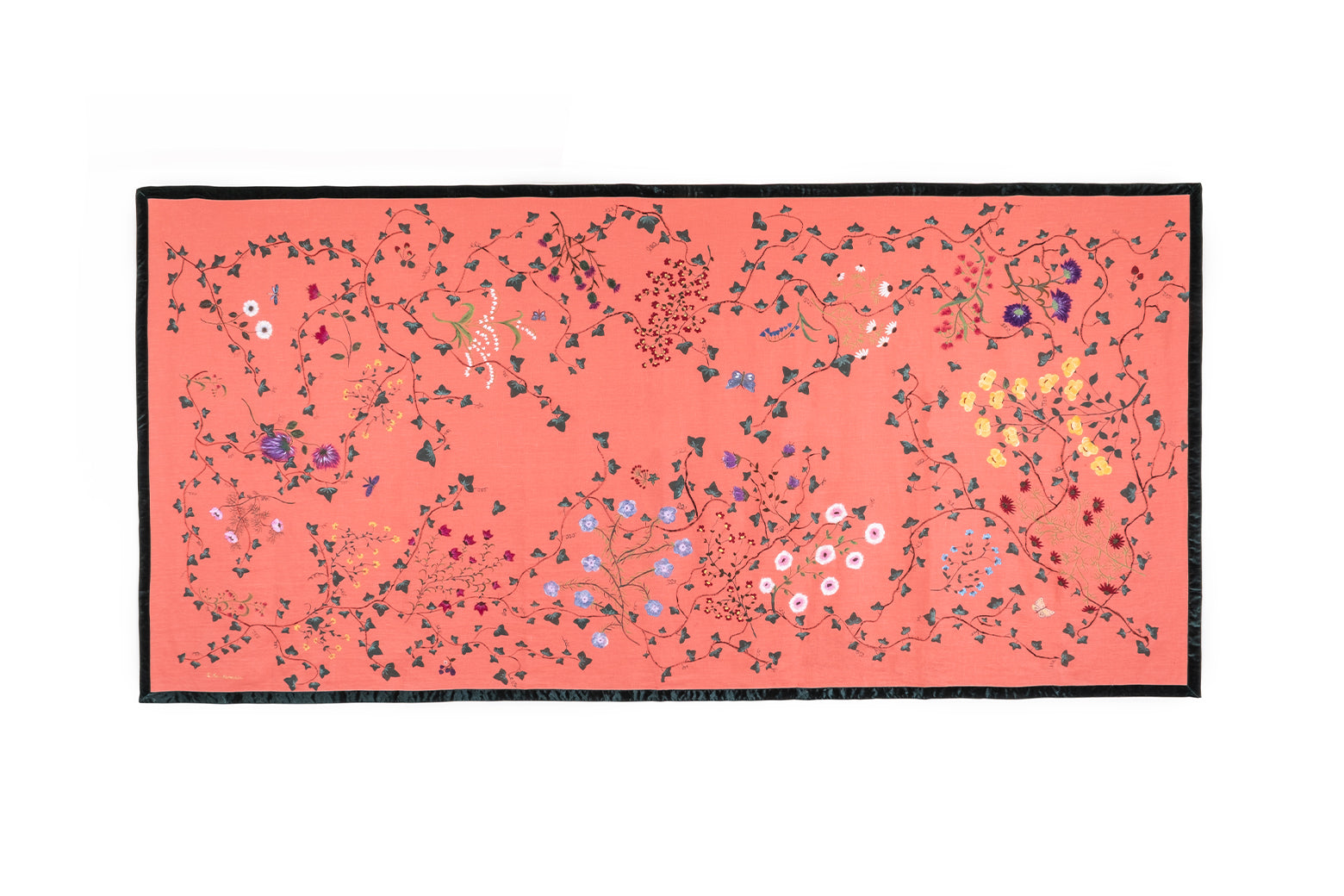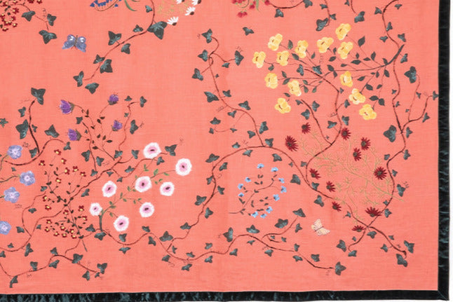 100% heavy linen. Totally hand-painted multi-coloured flower motifs on coral background.